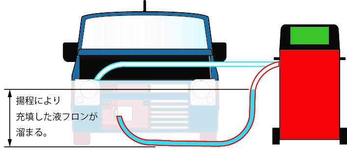 下部配管に溜まりこんだ液フロンを更に押し込みながら液充填を行うため、ホース内への溜まりこみが大きくなり、実質の充填量が少なくなる。 ☞ 低圧充填モードを使用することにより、より正確な充填を行うことができる。